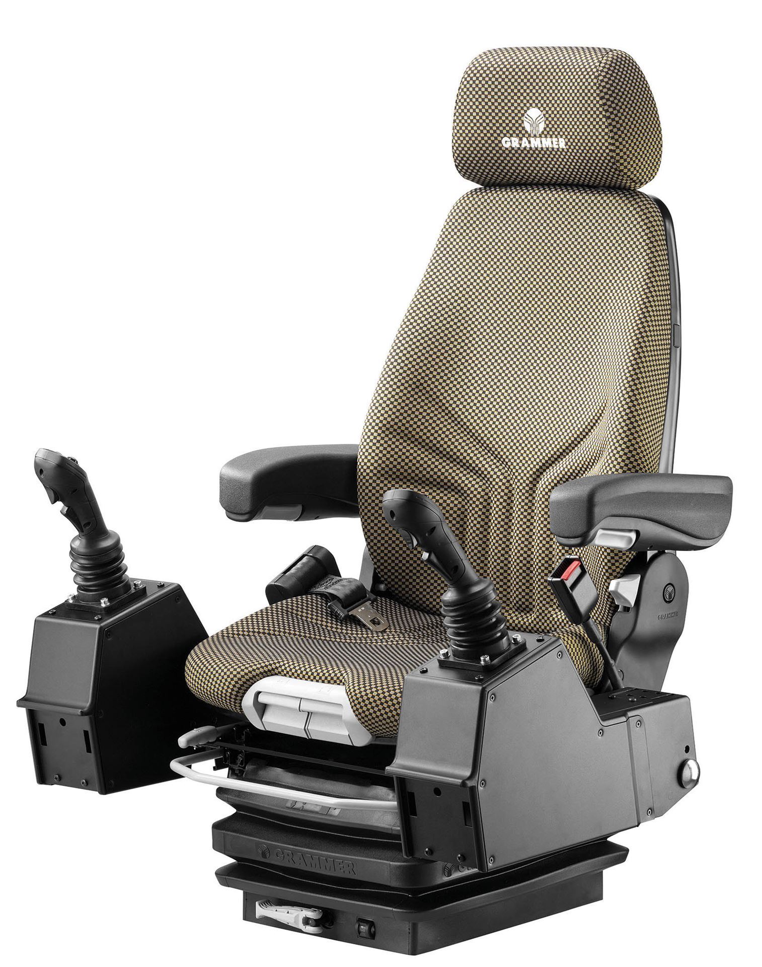 Compact air suspension with a mid-sized seat top suitable for small to medium tractors and machinery. Featuring 12V built in compressor, adjustable height, weight and stroke limiter, back recline, seat cushion length and tilt, 5 position mechanical lumbar, slide rails and a ride height indicator to aid with correct adjustment. Optional armrests, lap belt, swivel and 24V compressor.